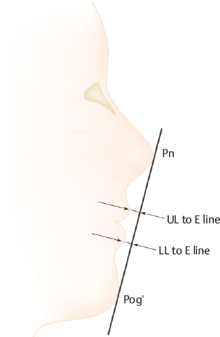 The “esthetic” line, or E-line, can be drawn from the nasal tip (pronasale) to the soft tissue pogonion (Pog′) to evaluate lip position (Fig. 22.2). The mean distance of the upper lip to the E-line is 0.41 mm in Asians and 4.72 mm in Caucasians; while the mean distances for the lower lip are 1.27 mm and 3.14 mm for Asians and Caucasians, respectively.4 Using these measurements, the position of the pogonion can be extrapolated. One pitfall to note is that this method relies heavily on the patient’s having a normally projected pronasale (nasal tip). Usually the pronasale is inadequately projected in Asians; thus, using this point as a reference in such patients can lead to an erroneous conclusion in identifying a retruded pogonion position.