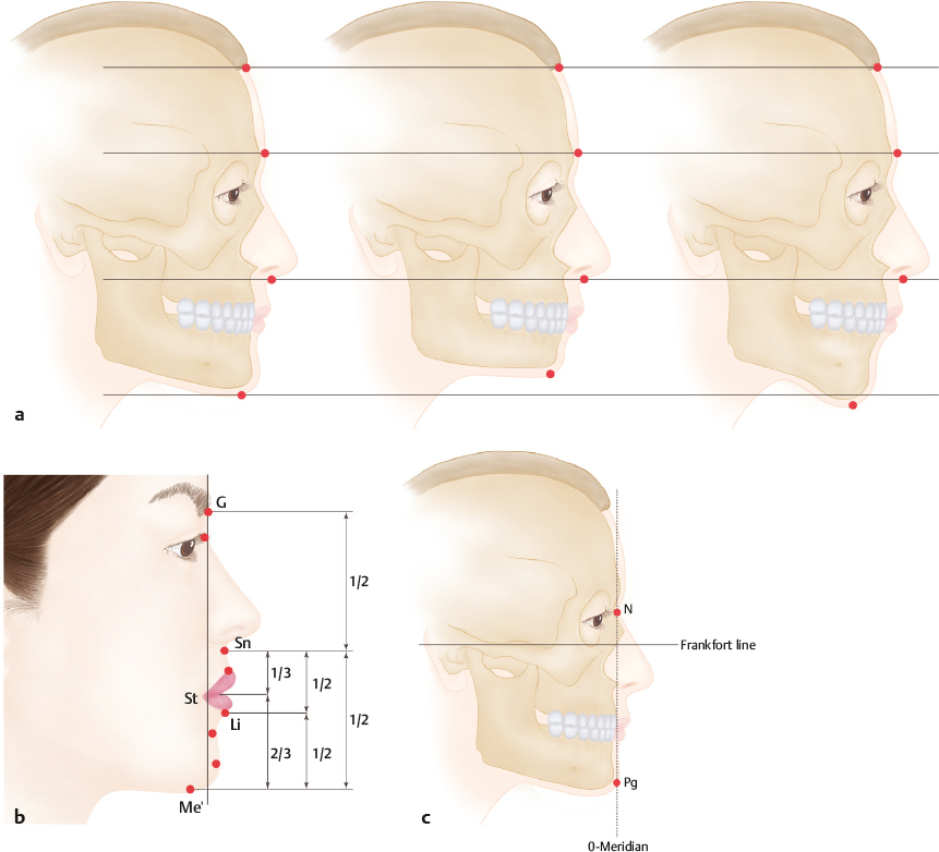 The concept of zero-meridian was described by Gonzalez-Ulloa in 1962.8 From the soft tissue N point, a line perpendicular to the Frankfort horizontal line (FH line), the line from the upper rim of the external auditory canal to the lower rim of the orbit, is drawn. This is known as the zero-meridian. The soft tissue pogonion is located along the zero-meridian (Fig. 22.3c).
