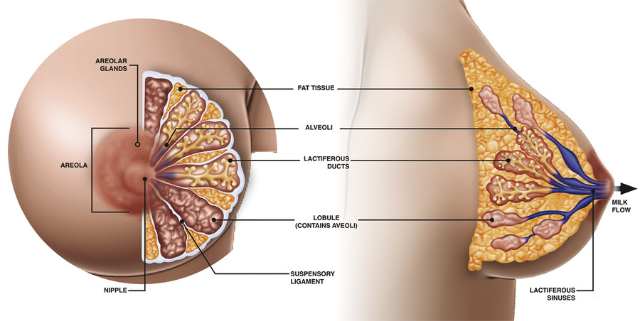 The NAC is a central breast structure that consists of the areola, which is distinguished from the rest of the surrounding breast tissue by its distinct change in skin pigment, as well as the nipple itself. The physiologic purpose of the NAC is to deliver milk, produced in the mammary glands of the breast, to an infant. The normal color of the areola can range from lighter to darker skin tones and can span the spectrum of pink to red to brown or nearly black, depending on the underlying skin color of the individual. Typically it is paler in those with lighter skin tones and darker in those with darker skin tones, but the pigment differs from that of the surrounding breast skin. Many believe this color difference makes it more visible and draws the attention of an infant attempting to breastfeed.