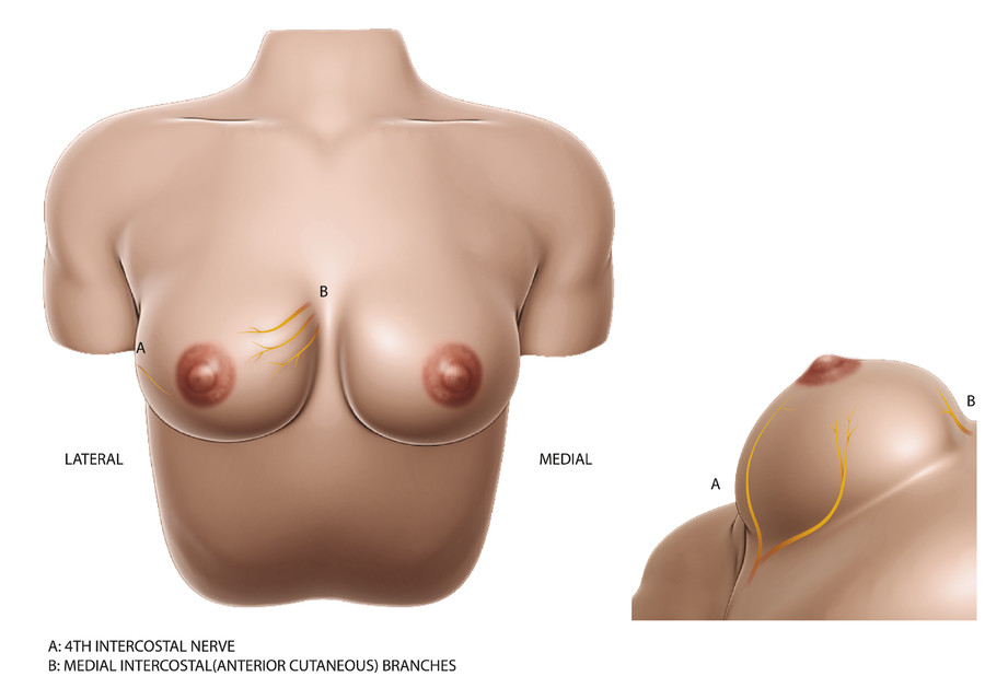 The nerve supply to the NAC is of particular importance, as the sensitivity plays a major role in morbidity and patient satisfaction after breast surgery. In several cadaveric studies, the nerve supply of the NAC has been dissected in order to understand its cutaneous innervation better. 8 , 9 The majority of the contribution to the sensory innervation of the NAC comes from lateral and anterior cutaneous branches of the second through fifth intercostal nerves (Fig. 22‑2). These studies have demonstrated that the most consistent of these contributions originates from the fourth intercostal nerve, specifically the lateral cutaneous branch; however, the anterior cutaneous branches of the third and fourth intercostal nerves were also highly consistent.