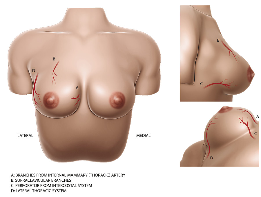 The blood supply to the NAC generally has contributions from the internal thoracic artery (internal mammary artery), intercostal arteries, and lateral thoracic artery (Fig. 22‑3). Studies have been made in order to understand better the contribution of each arterial system to the NAC so as to guide better surgical techniques. In one particular cadaveric study, van Deventer dissected the arterial anatomy of 27 female breasts and found that the most consistent contribution to the NAC was the internal thoracic artery (100%), followed by the anterior intercostal arteries (74%) and the lateral thoracic artery (70%). 10 In a separate study that reviewed thoracic computed tomography (CT) angiograms to identify arterial supply to the NAC, Stirling et al found that perforating branches from the internal thoracic artery contributed to NAC blood supply in 81.8% of patients, followed by lateral thoracic contribution in 23.5% of patients and anterior intercostal artery contributions in 15.9% of patients. 11 Other studies have also described minor contributions directly from other arterial systems, including the axillary artery and posterior intercostal arteries. Given that the NAC receives blood supply from multiple sources, one would think it is a highly vascularized structure with collateral supply if needed during surgery. Iris et al analyzed breast magnetic resonance imaging (MRI) in order to understand with what frequency the NAC was receiving blood from multiple zones or arterial systems rather than from one arterial system. They found that in 58% of patients, blood supply came from one general breast zone (medial, lateral, central, superior, or inferior), with the great majority coming from medial perforating vessels. Only 42% of patients had NAC blood supply come from multiple zones, with the vast majority being medial and lateral perforating branches. 12 This suggests that the majority of the blood supply to the NAC comes from medial perforating vessels from the internal thoracic artery, as well as some contribution from lateral perforating vessels from the long thoracic artery and intercostal arteries. Knowledge of the origin and direction from which the NAC receives its blood supply can better direct surgical approach and dissection in order to avoid disrupting NAC perfusion, which could lead to necrosis and nipple loss during surgery.