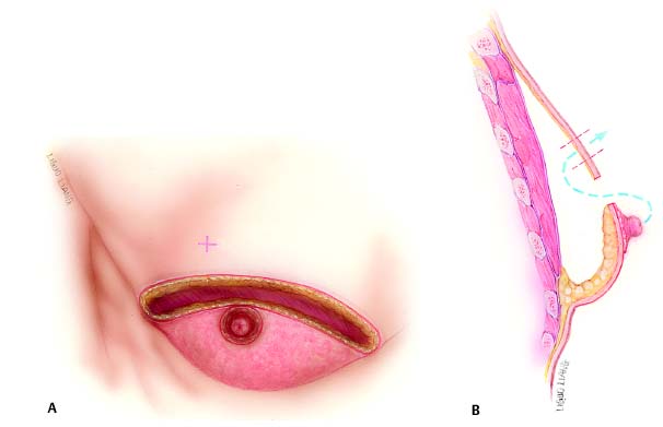 Patients with large breasts and MWL patients have in common a large amount of excess skin that cannot be managed in one stage without an incision beyond the areola. Additionally, the pedicled procedures preserve subareolar volume to achieve appropriate contour. The procedure described in this chapter employs an inferior pedicle similar to the reliable one utilized widely in female reduction mammoplasty. Subcutaneous mastectomy is accomplished to remove excess tissue, preserving the upper flap, which is advanced over the pedicle to the inframammary fold. An opening is cut in the flap to admit the nipple–areola. In addition to providing blood supply to the nipple–areola, the pedicle favorably augments the contour above the inframam-mary fold. MWL patients often display large skin excess that extends laterally to the axilla and arm. The lateral inframam-mary incision can be extended posteriorly to provide skin excision and contour correction in these areas.
