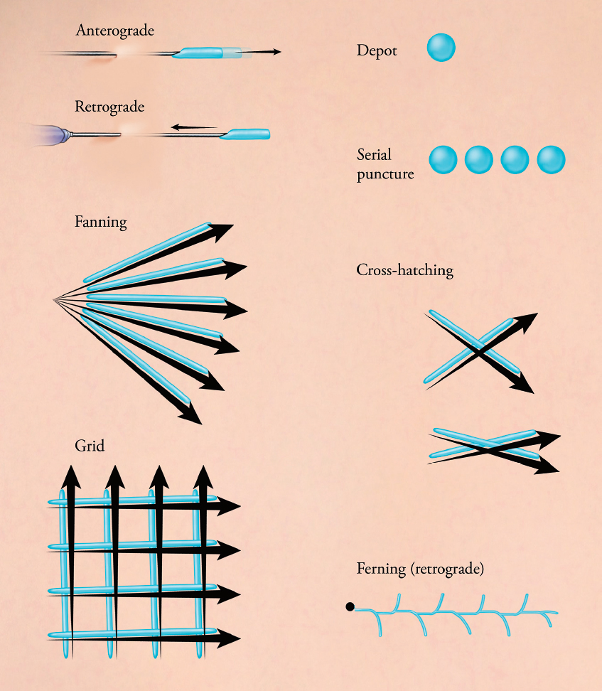 Fig. 23.1 Injection techniques. (Used with permission from Kontis TC, Lacombe VG. Cosmetic Injection Techniques: A Text and Video Guide to Neurotoxins and Fillers. New York: Thieme; 2013: 102.)