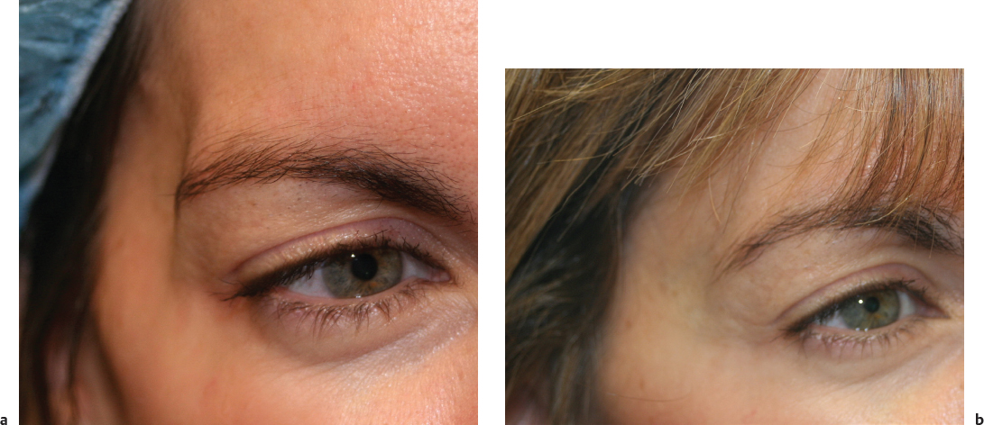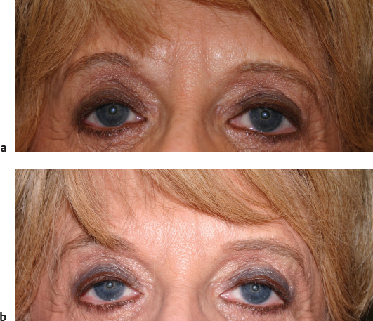Aging in the forehead region is characterized by brow ptosis and deep hyperfunctional rhytides. Currently, neuromodulators to the forehead muscles are the main rejuvenation strategy prior to forehead lift. Deep static rhytides resulting from repeated muscle contraction of the frontalis, corrugulator, and procerus muscles and volume loss associated with aging may not completely resolve with botulinum toxin injection alone. Static rhytides can be treated with a combination of neuromodulators and/or facial fillers to smooth and soften the forehead, which will rejuvenate the face and also give a more relaxed look ( Fig. 23.3 ). 66