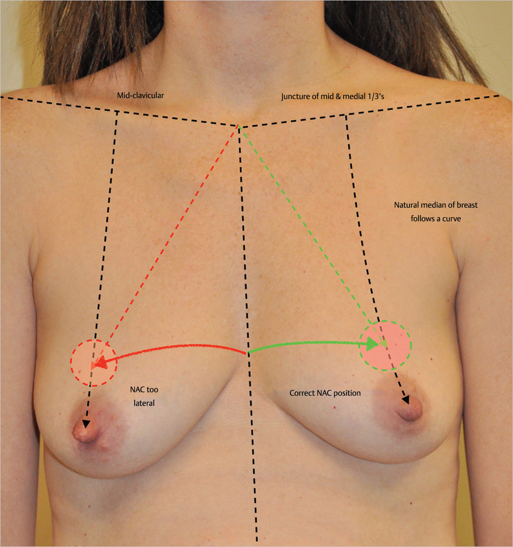 My preference is to drop a slightly curved line from the junction of the medial and central thirds of the clavicle to the nipple, allowing the nipple position to migrate upward in a more natural curved progression along the true median of the breast.