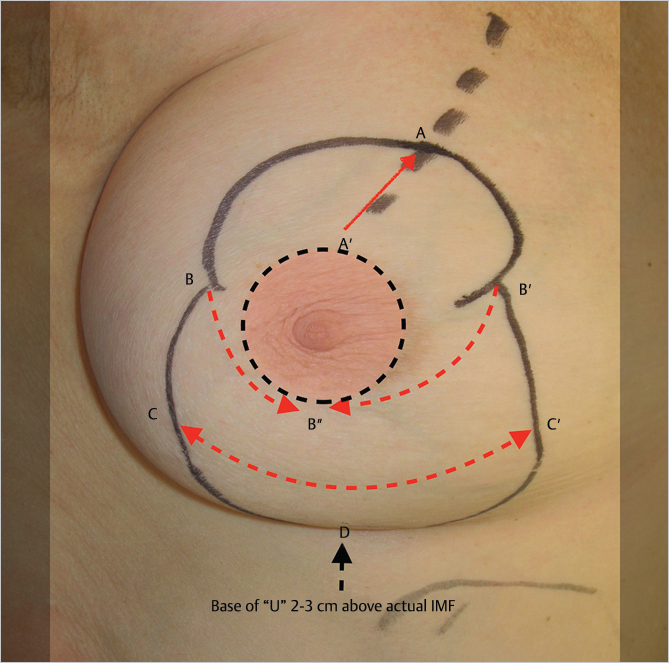 The nipple is marked 1 to 2 cm above the existing inframammary crease (i.e., slightly above Pitanguy’s point), along the median of the breast. The upper point of the new areolar location (point A in ▶Fig. 23.2) is typically marked at 18 to 20 cm from the nipple to the notch, depending on the patient’s height and chest wall length. This places the nipple itself at 20 to 21 cm from the sternal notch. An inverted C-shaped dome incision is marked, with the lower limbs of the inverted C ending at or just below the lower border of the preexisting areolar position (points B and B’ in ▶Fig. 23.2). The medial and lateral portions of the dome should not be too wide as this places excessive lateral tension across the freshly sutured NAC. The breast is displaced medially, and a perpendicular line is dropped along the median of the breast to within 2 cm of the inframammary crease. The breast is displaced laterally, and the medial vertical incision is marked in a similar fashion. The two vertical incisions are joined by a gentle U-shaped incision with its base 1 to 2 cm above the inframammary crease (point D in ▶Fig. 23.2).