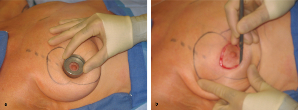 Fig. 23.3 (a,b) “Cookie cutter” marking or areolar diameter and periareolar incision.