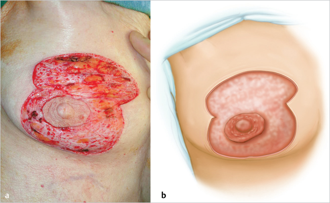 Fig. 23.4 Deepithelialized breast skin. (a) Intraoperative view, (b) diagrammatic representation of extent of deepithelialization in vertical mastopexy.