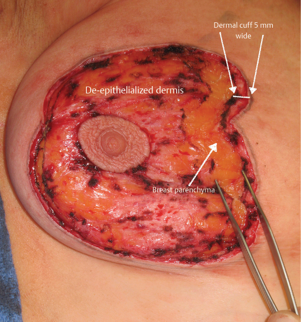 The dermis of the periareolar inset is incised full thickness down to the parenchyma, 3 to 5 mm within the outermost circumference of the areolar skin inset. This provides a 3- to 5-mm dermal cuff in preparation for the periareolar Gore-Tex suture insertion (▶Fig. 23.5).