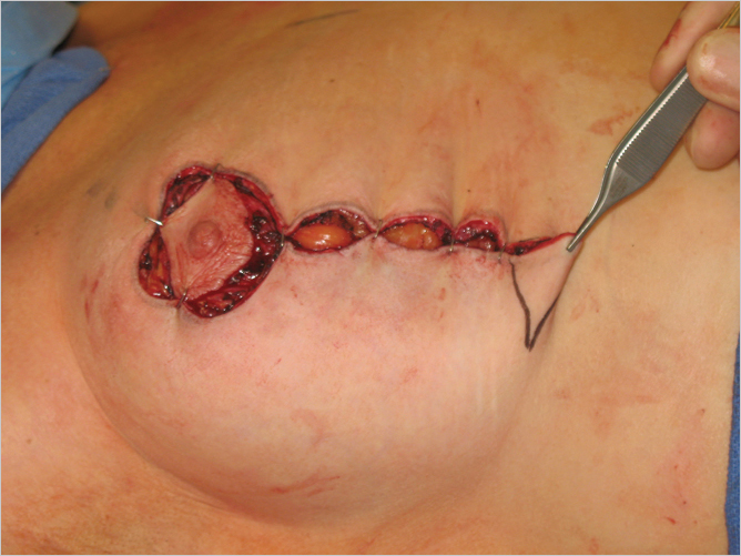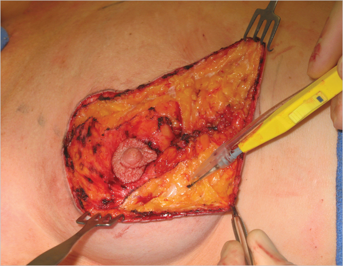 Fig. 23.8 About 1-cm thick skin-parenchymal flaps are raised 2 to 3 cm laterally and medially to allow for vertical skin closure over the central glandular imbrication.