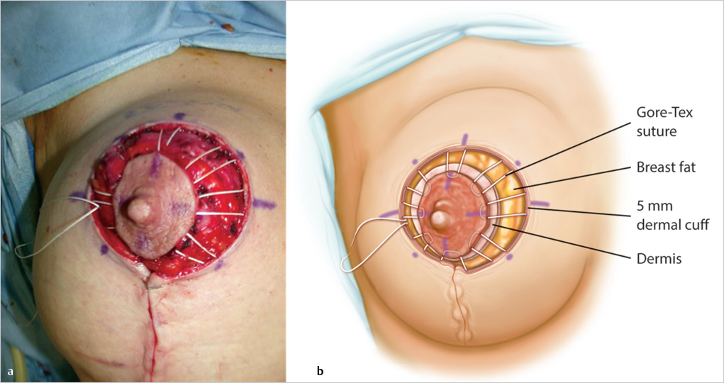 The insertion of the Gore-Tex periareolar suture is a key step toward achieving a stable nipple–areolar diameter in the long term. The use of absorbable sutures tends to permit late stretching of both the areola diameter and the periareolar scar. The areolar inset is first divided into four major and then an additional four minor quadrants with a marking pen. Reciprocal markings are performed on the NAC itself to match the inset markings.