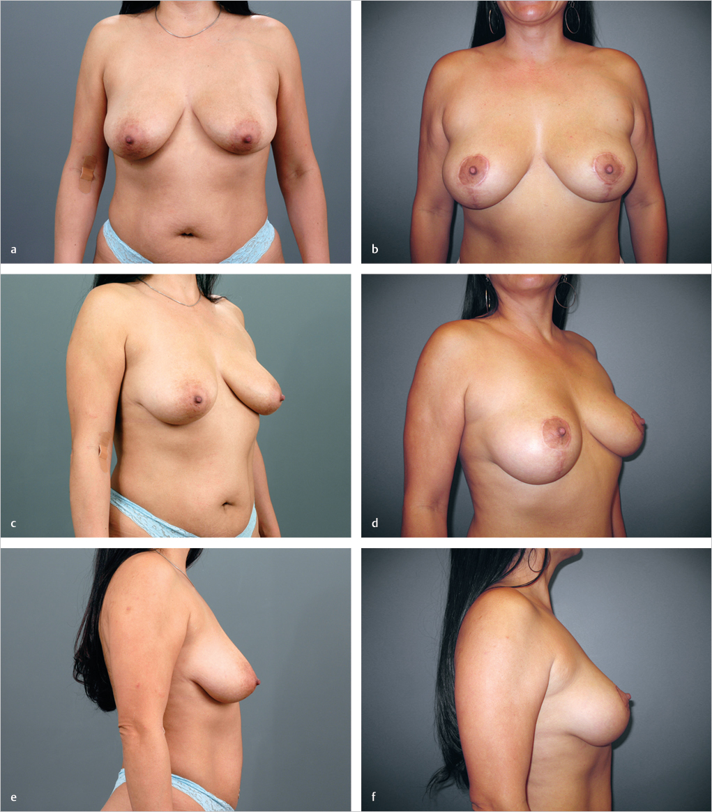 Fig. 23.14 A 35-year-old woman with ptosis requesting vertical mastopexy without augmentation. She is shown 16 months postoperatively with pleasing ptosis correction. (a) pre-op AP view, (b) post-op AP view, (c) pre-op oblique view, (d) post-op oblique view, (e) pre-op lateral view, (f) post-op lateral view.