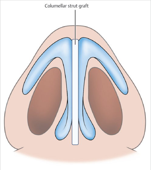 • The columellar strut graft is placed to ensure that it is an invisible graft, which is used to structurally support the lower lateral cartilages and avoid any direct contact with the skin. Particularly in the interdomal area, any visibility of the graft beyond the lower lateral cartilage is to be avoided.