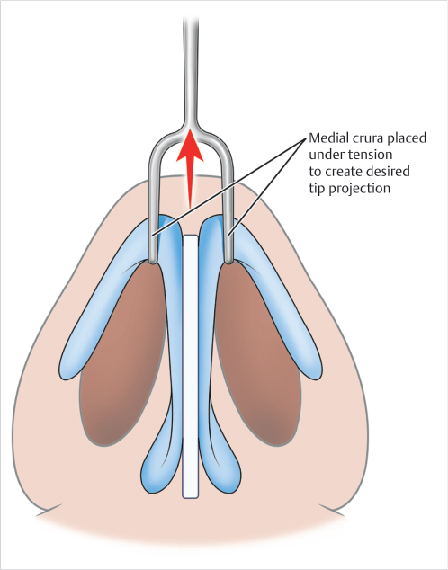 • The interrelationship of the structures is then assessed and sutured together using 5–0 PDS sutures in a horizontal mattress fashion. Sutures are placed inferiorly and then again in the infratip area. Careful attention is paid to ensure the medial crura are oriented in a symmetric fashion in all planes.