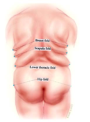Based on examination of multiple postbariatric plastic surgery patients, we have developed nomenclature for the various back folds to clarify the surgical management of each fold. The superiormost fold is a posterolateral extension of the breast fold related to the inframammary fold and is thus referred to as a breast fold or roll. The next highest fold is the scapula fold. The lower truncal back folds are the lower thoracic fold and hip fold ( Fig. 24.1 ). A fifth roll is infrequently identified near the axilla.