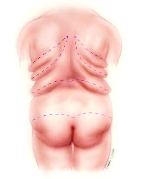 Surgical management of morbid obesity offers sustained massive weight loss (MWL). Acceptance of bariatric surgery as an effective method of weight loss has led to increases in the number of these procedures and, subsequently, an increase in bariatric plastic surgery. According to the American Society of Plastic Surgeons’ statistics, almost 60,000 body-contouring procedures after massive weight loss were performed in 2008. Body contouring in the MWL patient involves treatment of multiple areas of redundant skin and subcutaneous tissue, usually in a staged manner. Although much has been written about the surgical management of the abdomen, chest and breasts, arms, buttocks, and thighs in these patients, the back has received relatively less attention. Excess back tissue causes difficulty fitting into clothes and brassieres. It can also contribute to back pain. This chapter reviews the anatomy of the back folds and details our approach to back contouring in postbariatric weight-loss patients. In general, up to four individual back rolls are observed in weight-loss patients, each requiring surgical correction: breast fold, scapula fold, lower thoracic fold, and hip fold.
