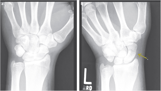 Fig. 24.3 Scaphoid fracture X-ray (a) posteroanterior view compared with (b) navicular view, which allows better visualization of scaphoid waist fractures.