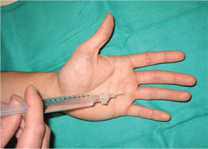 The common digital nerve is blocked by inserting the needle at the level of the distal palmar crease, just to one side of the metacarpal neck. Two milliliters of local anesthetic is injected, blocking the common digital nerve as it travels toward the finger. The flexor sheath block is performed by inserting the needle at the level of the palmar digital crease, in the center of the long axis of the finger. The needle is inserted until it touches the bone, then while slight pressure is put on the syringe plunger, the needle is withdrawn until the anesthetic begins flowing easily into the flexor sheath. Two milliliters is injected. While this technique does provide good pain relief, patients can experience discomfort from the pressure of the volume in the closed space of the flexor sheath. Care should be taken to avoid injecting too much volume into this potential space. 5 , 7