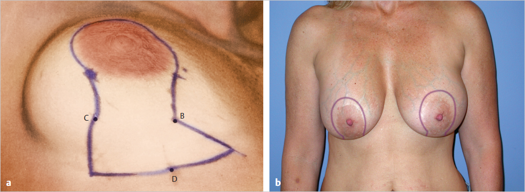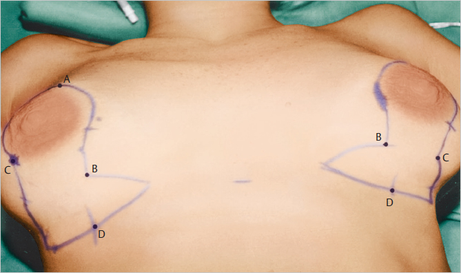 Markings are made with the patient in the sitting position. The point A for the top of the areola is about 1 to 2 cm above the inframammary crease, and between 22 and 23 cm from the sternal notch depending on the breast volume. The vertical limbs extend inferolaterally from the 7 and 5 o’clock positions on the lower areolar marking for a distance of 10 cm to points B and C. From these lowermost tips the lateral and medial wings of the horizontal excision can be marked, but I usually do not incise and commit to the horizontal excision until the augmentation is complete. This central inverted V is designed beginning at the point of the areola apex and extending around the nipple–areola to a point approximately 10 cm below the top of the future areola position. This is basically a conservative skin ellipse; additional skin can be removed at the end of the procedure. The markings are made in the inframammary crease. The breast is displaced, first laterally and then medially, to connect the lines that mark the future inframammary crease. The new diameter of the nipple–areolar circle is drawn, usually 38 to 42 mm. The incision is made around the nipple–areola, and the upper skin within the V markings is deepithelialized (▶Fig. 24.5).