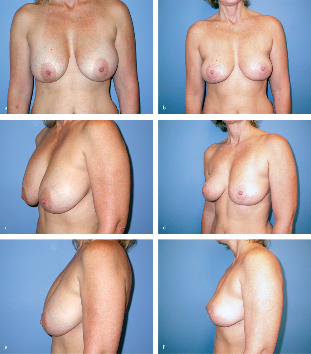 This 41-year-old woman had bilateral subglandular augmentation with periareolar mastopexy 10 years ago. She had always been dissatisfied with the heaviness of her augmented breasts and was troubled by unattractive venous distension within the skin of the breasts. This engorged appearance never resolved with time. She requested explantation with further mastopexy to improve her breast shape and reduce their weight. The implants were removed, creating more ptosis intraoperatively as expected. A vertical mastopexy was performed, but I thought that she would benefit from a transverse skin resection, and a short horizontal scar was incorporated in this procedure. The patient is shown 2 years after the procedure, with acceptable breast shape, retention of ptosis correction, and dramatic reduction in venous engorgement of her breasts. She was delighted with the outcome, despite the decreased breast volume (▶Fig. 24.3).