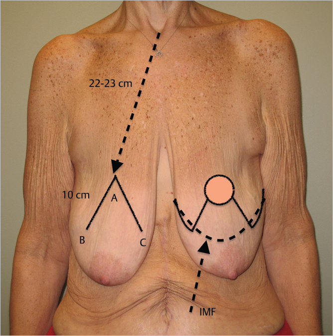 • Planning for a vertical limb approximately 6 to 7 cm from the areola to the inframammary fold (IMF) to ensure a short vertical limb and placement of the horizontal scar in the IMF.