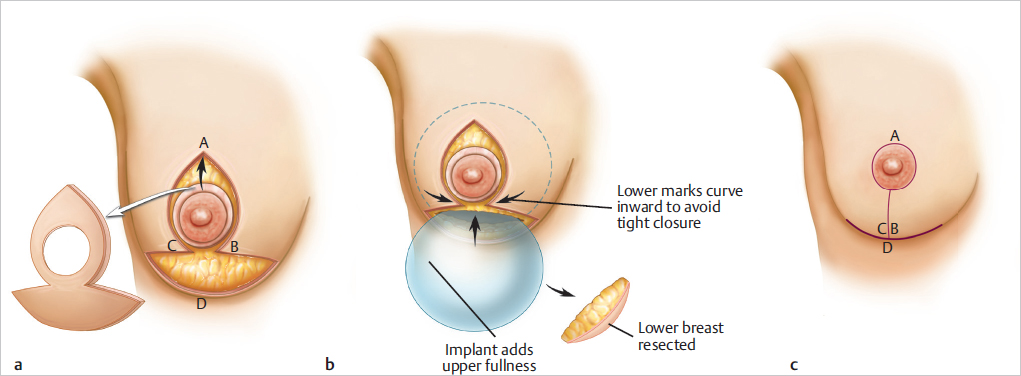 The incision is made about the proposed new areolar circumference, and the skin of the vertical ellipse is excised. The dissection proceeds around the lower pole of the breast parenchyma. A subpectoral dissection is made for placement of the implant beneath the pectoralis major muscle above and in the subglandular position below. After the 325-cc implant is placed, the margins of the skin excision are approximated, and the nipple–areola is moved to the new position. The distance from the lower areolar margin to the inframammary fold (IMF) is determined. A point about 6 to 8 cm below the areolar margin, depending on the implant diameter and breast width, is selected and marked as the IMF. The skin between these two points is the amount to be removed. It is marked out as the shortest possible ellipse, excised, and closed with layered absorbable sutures (▶Fig. 24.2).