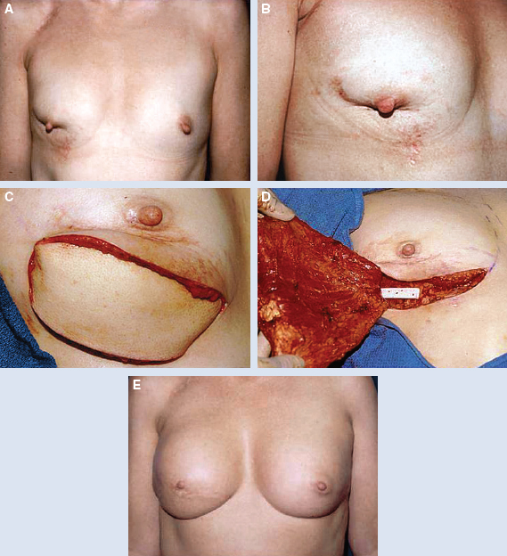 This patient presented with a retracted nipple-areola complex (NAC) 2 years after a lumpectomy and radiotherapy. Radiation changes to the skin included local hypopigmentation and telangiectasia (A and B). These changes necessitated a wide excision with release of the nipple-areola complex and resection of the damaged skin (C). A latissimus dorsi flap with a large cutaneous island was used to reconstruct the lower pole defect (D). Subpectoral implants were placed for symmetry. The size and shape are maintained 4 years after the flap transfer (E).