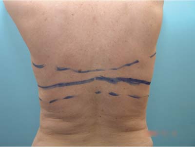 Laxity and redundancy of the skin and subcutaneous tissue of the upper back can be very bothersome and unsightly for both the massive weight loss patient and many nonobese patients. Sun exposure, weight fluctuations, and increasing age are the main factors contributing to this deformity. Patients express considerable concern about this tissue redundancy when it creates visible irregularities, particularly when wearing form- fitting clothing. A bulge above, a depression at, and a bulge below the bra line are very disconcerting to many patients. Traditionally, this area has represented a considerable challenge for plastic surgeons, as lower-body contouring procedures, such as a circumferential abdominoplasty or body lifting, fail to treat this area. The strong force exerted by buttock and flank lifting does not extend to the upper back because of the very robust midline zone of adherence.18 Several anterior upper trunk procedures such as reduction mammaplasty and mastopexy can address this area indirectly if extended posteriorly enough, but we report the bra-line back-lift technique that has been specifically designed to eliminate upper back laxity and redundant tissue so bothersome to many patients.912 The surgery involves resection of skin and fat through an incision that is placed in the bra line. It is a highly effective procedure with a minimal downtime that can be used as an isolated procedure or in combination with reverse abdominoplasty, mastopexy, or reduction mammaplasty. This treatment has been associated with a very high level of patient satisfaction and a remarkably low complication rate.13