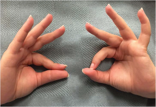 Additional physical exam findings can be noted with ulnar nerve compression. Patients will hold an object, such as a piece of paper, in the first web space by flexing the IP joint using the unaffected flexor pollicis longus instead of using the weakened adductor pollicis. This is known as “Froment’s sign” (Fig. 27‑4). The patients may not be able to adduct the small finger with the weakened palmar interosseous muscle due to the unopposed extensor digit quinti, innervated by the radial nerve. This is known as the “Wartenberg’s sign” (Fig. 27‑5).