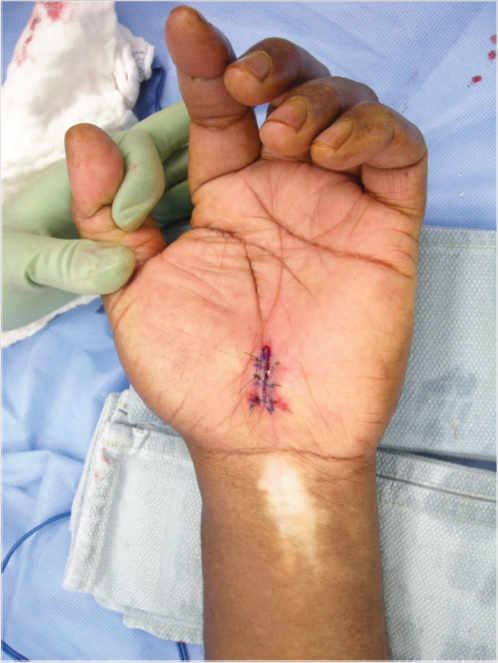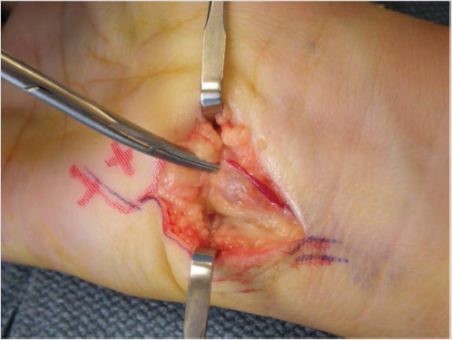 During open release, synovectomy and manipulation of the nerve are not indicated except for specific cases of synovial hypertrophy that need debulking. A forearm-based tourniquet is well tolerated and is set to 225 mm Hg after manual exsanguination. We recommend a median nerve block using 1% lidocaine and 0.25% Marcaine placed at the distal wrist crease in preoperative holding to allow time for the medication to work and dissipate from the surgical site. The carpal tunnel can be released under direct vision by making a longitudinal incision over and through the TCL from the volar wrist flexion crease, staying in line with the radial border of the fourth ray. Visualization of the palmar fat is the distal end point. A tenotomy scissors can be used to release the distal end of the antebrachial fascia in the forearm, staying ulnar to the palmaris longus tendon. The TCL is about 2 cm in length. The days of large palmar and forearm dissections are long gone and unnecessary, and only contribute to prolonged recovery and scar adhesions.