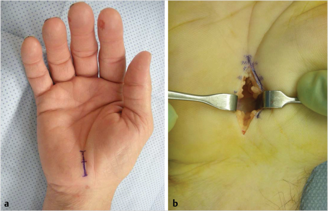 Fig. 27.7 (a) Marking for open carpal tunnel release and (b) intraoperative view.