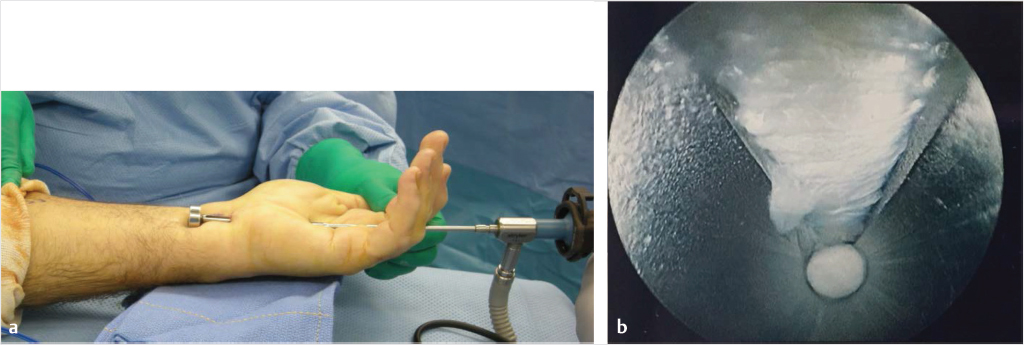 Fig. 27.8 (a) Endoscopic carpal tunnel release and (b) endoscopic view of transverse carpal ligament.