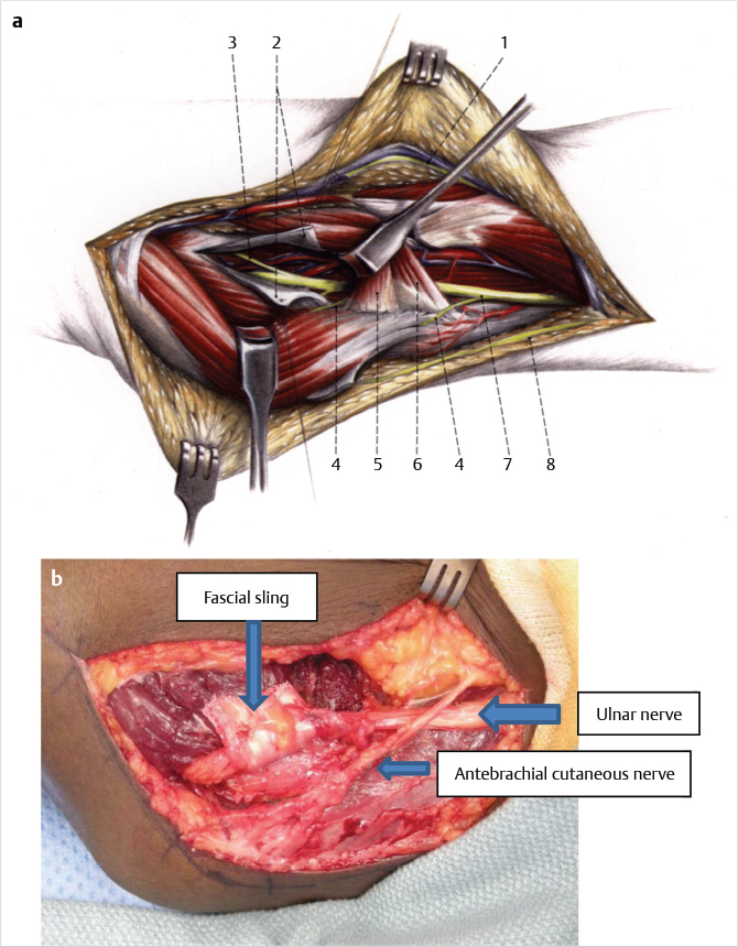Fig. 27.9 (a,b) Fascial sling created during cubital tunnel release. (a) Used with permission from Pechlaner S, Kerschbaumer F. Atlas of Hand Surgery. New York, NY: Thieme Medical Publishers; 2000