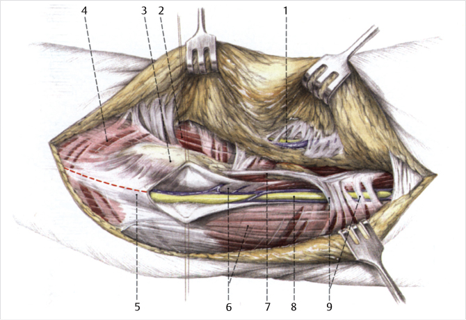 Fig. 27.10 (1) Medial fascicle of the medial antebrachial cutaneous nerve. (2) Brachialis. (3) Medial epicondyle. (4) Common head of the flexors. (5) Canal of the ulnar nerve. (6) Triceps. (7) Medial intermuscular septum. (8) Ulnar nerve. (9) Arcade of Struthers. Used with permission from Pechlaner S, Kerschbaumer F. Atlas of Hand Surgery. New York, NY: Thieme Medical Publishers; 2000