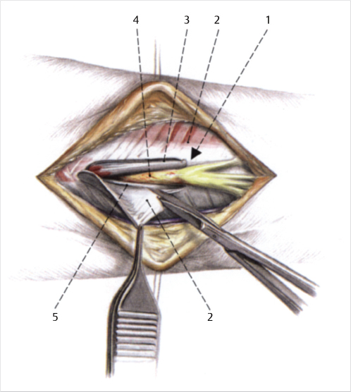 Fig. 27.11 4–44 Decompression of the superficial branch of the radial nerve at its point of entry into the fascia of the forearm between the brachioradialis and extensor carpi radials longus partial resection of the forearm fascia. (1) Point of entry of the superficial branch of the ulnar nerve into the forearm fascia. (2) Forearm fascia (partially resected). (3) Brachioradialis. (4) Superficial branch of the radial nerve. (5) Extensor carpi radials longus. Used with permission from Pechlaner S, Kerschbaumer F. Atlas of Hand Surgery. New York, NY: Thieme Medical Publishers; 2000