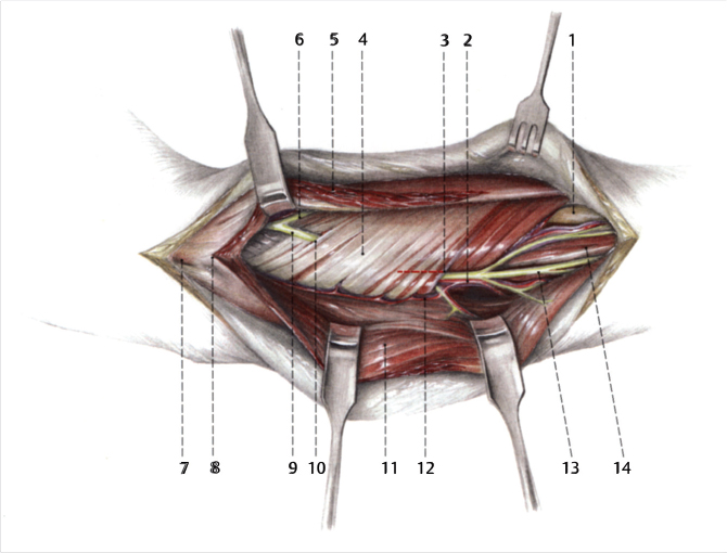 Fig. 27.12 The radial nerve is exposed in the supinator tunnel between the extensor carpi radialis brevis and extensor digitorum. (1) Abductor pollicis longus. (2) Posterior interosseous artery. (3) Point of exit of the deep branch of the radial nerve from the supinator tunnel. (4) Supinator. (5) Extensor carpi radialis brevis. (6) Superficial branch of the radial nerve. (7) Lateral epicondyle. (8) Lateral humeral intermuscular septum. (9) Deep branch of the radial nerve. (10) Arcade of Frohse (point of entry of the radial nerve into the supinator tunnel). (11) Extensor digitorum. (12) Interosseous recurrent artery. (13) Posterior interosseous nerve. (14) Extensor pollicis brevis. Used with permission from Pechlaner S, Kerschbaumer F. Atlas of Hand Surgery. New York, NY: Thieme Medical Publishers; 2000