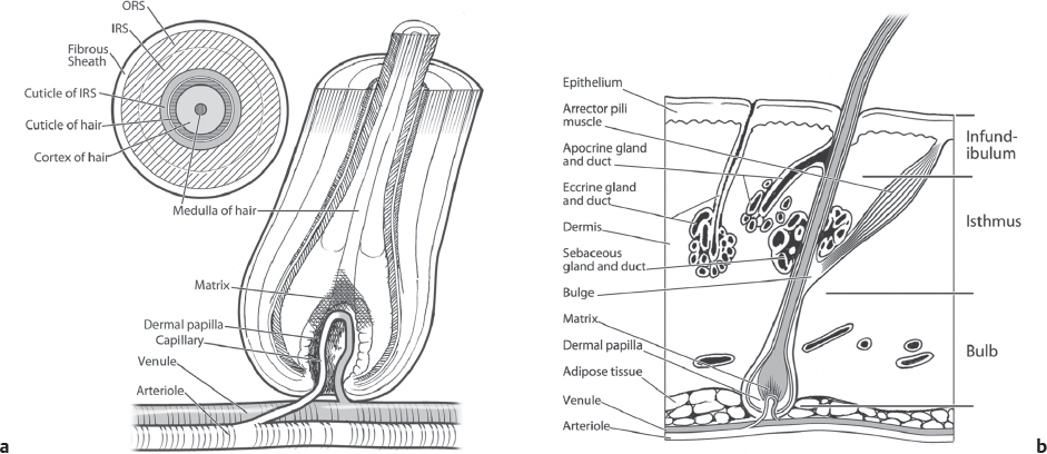The hair follicle is divided from superficial to deep into three segments: the infundibulum, isthmus, and bulb ( Fig. 28.1 ). The infundibulum extends from the follicular ostium to the entrance of the sebaceous duct. The isthmus extends from the sebaceous duct to insertion of the arrector pili muscle. The lower segment consists of the bulb and is located between the arrector pili insertion and the base of the follicle. The bulb contains the hair matrix, dermal papilla, and the melanocytes that are responsible for hair color. The dermal papilla regulates hair growth and development and is thought to house multipotent stem cells. Under the direction of the dermal papilla, the cells of the hair matrix divide, giving rise to the growing hair shaft and internal root sheath.