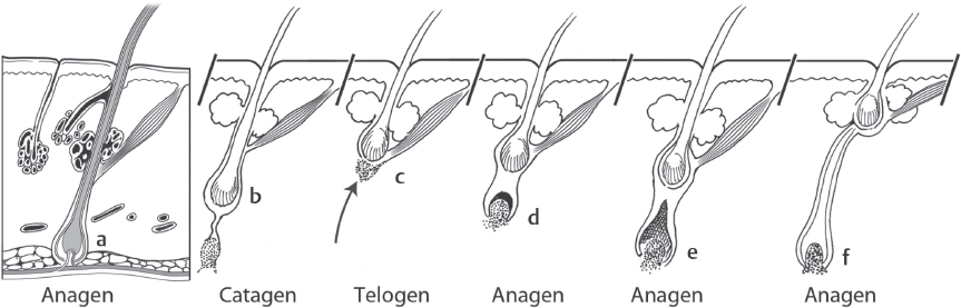 The follicular life cycle consists of three stages: anagen, catagen, and telogen. Anagen is the active growth and lasts 3 to 4 years. Approximately 90% of hairs on the scalp are in the anagen phase. The anagen phase is followed by catagen—the involution phase lasting 2 to 3 weeks. During the catagen phase, the inferior portion of follicle ascends superficially to the level of arrector pili attachment. Telogen is the resting phase lasting 3 months. Ten percent of hairs on the scalp are in the telogen phase ( Fig. 28.4 ).