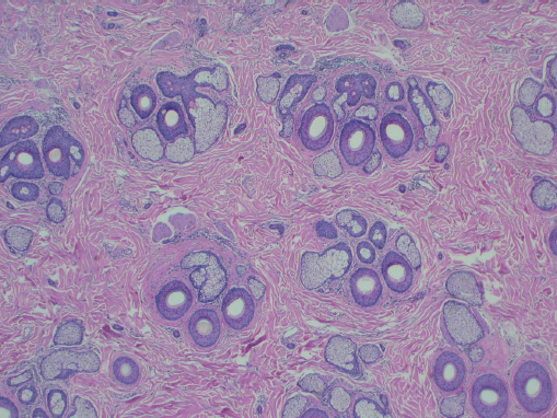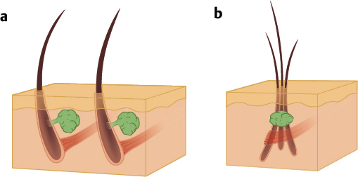 Hair follicles of the scalp naturally exist as follicular units ( Fig. 28.2 ). The follicular unit consists of one to four terminal hairs with or without several vellus hairs, a sebaceous gland and duct, arrector pili muscle, and a common vascular and neural plexus. The entire unit is surrounded by a connective tissue sheath. Using microscopy, the structure of the follicular unit and the surrounding area of non–hairbearing skin is visible ( Fig. 28.3 ).