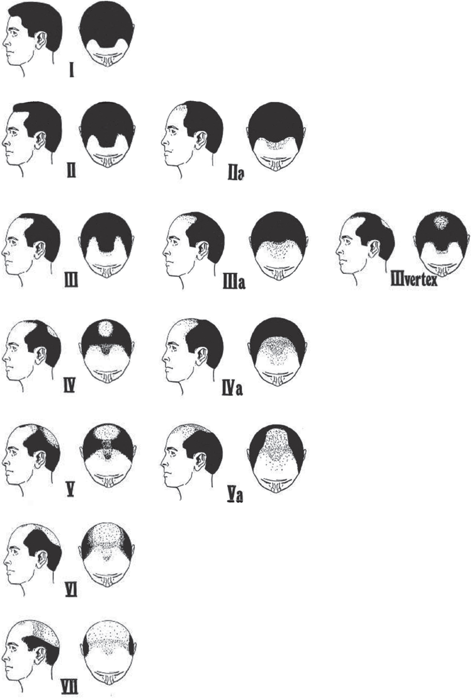 On physical exam, the pattern of hair loss should be documented. In males, the Hamilton classification modified by Norwood is used to classify the pattern and severity of hair loss 18 ( Fig. 28.5 ). Males with androgenic alopecia usually present with hair recession in the frontotemporal areas and hair loss in the vertex area. With age, these areas enlarge and coalesce. However, patients seldom fit exactly into a single category and must be classified based on the closest fitting. In the Hamilton-Norwood classification scheme, males are classified as: