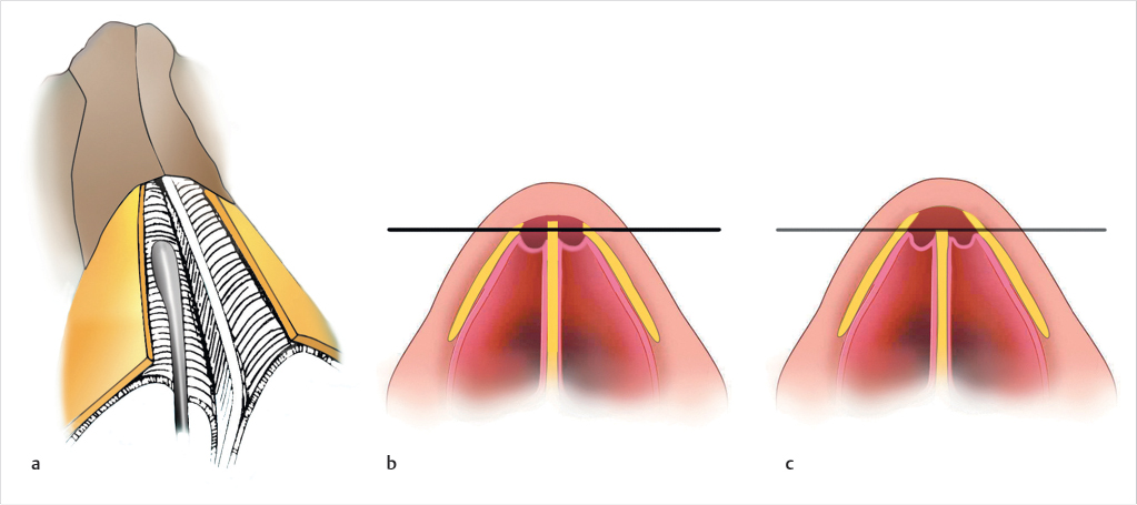 Inadequate support can lead to midvault collapse resulting in an aesthetically displeasing inverted-V deformity. Maximal control with a graduated approach of the dorsum is critical.