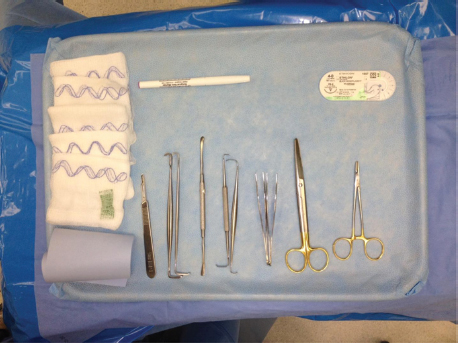 Sterile skin marker Raytech sponges Esmarch bandage #15 scalpel Senn retractors (2) Freer elevator Ragnell retractors (2) Adson forceps (2) Mayo straight scissors Webster needle driver 4-0 nylon suture Xeroform 1 × 8 strip Kerlix wrap (4″) Gauze sponges, sterile (4 × 4) Ace wrap (4″) |