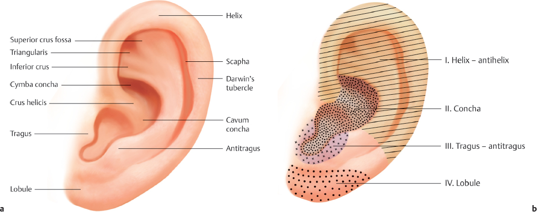 Analysis of the convolutions of the normal auricle begins with the helix and antihelix. They begin inferiorly at the level of the tragus and diverge as they extend superiorly. They are separated through their course by the scaphoid fossa. As the antihelix is followed superiorly, it divides into a smoother, wider superior crus and an inferior crus, which characteristically is narrower and sharper. The fossa triangularis lies between the superior crus and the inferior crus. From the frontal viewpoint, the helix forms the most lateral extent of the auricle superiorly and should be just visible behind the antihelix and superior crus.