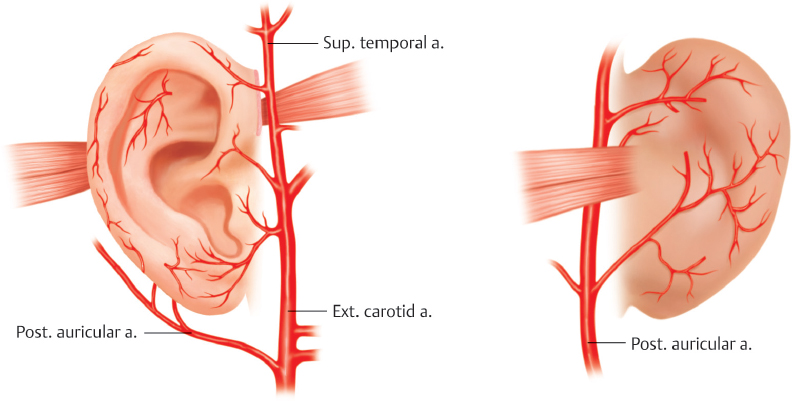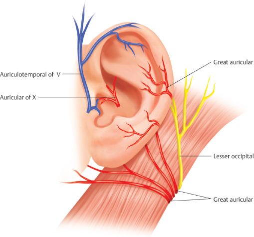 Fig. 29.3 depicts the arterial blood supply of the auricle. Contributions are primarily from the superficial temporal artery and the posterior auricular artery, although some branches also feed from the deep auricular artery. Venous drainage is via the superficial temporal and posterior auricular veins. Lymphatic drainage is to preauricular and superficial cervical nodes.