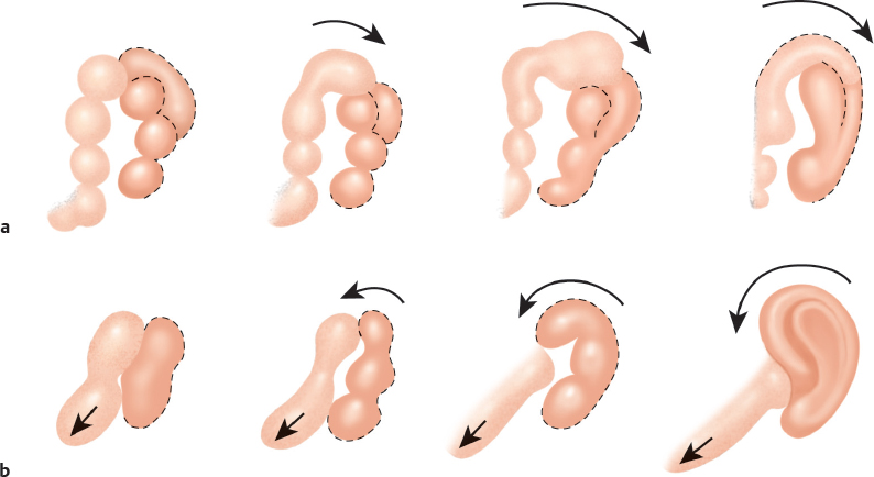 The hillocks of His refers to a description by that author of six visible protruberances in the 39-day embryo that develop into the auricle. Although His originally traced the origin of the first three hillocks to the first branchial arch and that of the second three hillocks to the second branchial arch, subsequent studies have challenged this theory. It now appears that only the tragus may be traced to the first branchial arch and that the remainder of the auricle is derived from the second branchial arch ( Fig. 29.5 ). This is supported by the location of congenital preauricular pits and fistulae located along the anterior incisura and incisura intertragica. Because these regions anatomically represent the dividing line between the first and second branchial arches, these anomalies would therefore arise from the first pharyngeal depression. 2 , 8 , 9 The majority of auricular deformities are inherited in an autosomal dominant pattern. 10 Similar inheritance patterns are also seen in preauricular pits and appendages.