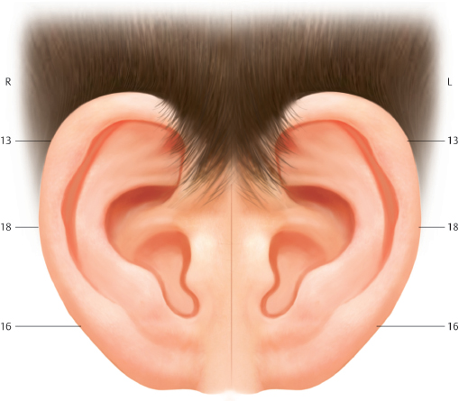 Like all facial plastic surgical procedures, otoplasty requires precise preoperative evaluation and analysis. Each ear must be evaluated separately because the deformity or deformities present may be very different between the two ears. The auricle should be evaluated as to its size, its relationship to the scalp, and the interrelationship between its four components (helix, antihelix, concha, and lobule). Typical measurements recorded during the preoperative examination include the following:
