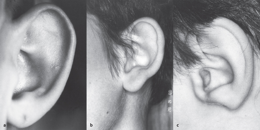 Deformities of the auricle have inspired much creative analysis over the years. In fact, certain characteristics (e.g., prominent Darwin’s tubercles and flattened helical margins) have been suggested as predisposing to criminal behavior. 2 The particular deformity addressed in this chapter is actually a group of deformities that have a common overall appearance of the prominent auricle. This may result from the classic absence of the antihelix, from overprojection of the concha, or from a combination of these deformities. Less frequently, a twisted or overprojected lobule may exacerbate the deformity.