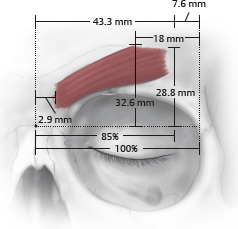 Corrugators start 3 mm lateral to midline and end about 85% of distance to lateral orbital rim. 3