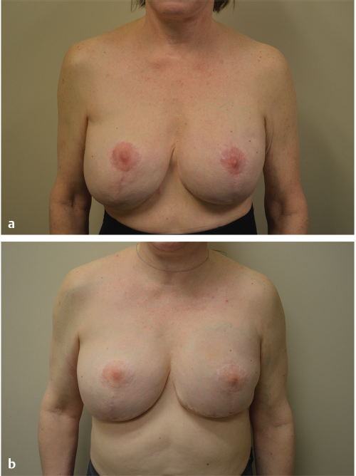 Breast flaps should be kept short with minimal undermining to maintain blood supply, and if raised, shsould be done so on reliable pedicles. Length to breadth ratios should be kept to within a maximum of 3:1. Greater lengths may induce fat necrosis resulting in coarse calcifications visible on mammography. It should be remembered that these patients have already demonstrated a marked tendency for their parenchymal support to fail. The use of complex breast flaps to shape and hold the breast in position is likely to meet with little success in the long term. If extensive internal support is required, it is preferable to use some form of acellular dermal matrix (ADM) to act as an antigravitational sling. In this setting, I prefer porcine dermal matrices over human donors, as the porcine matrix has less potential for stretch.