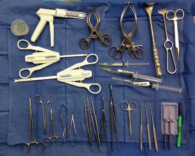 For successful performance of perforator flap surgery, surgeons should evaluate microsurgical instrumentation and equipment and select the instruments with which they feel comfortable. This may require inspecting the myriad instruments that are already available in the OR. Surgeons’ height, hand size, and experience will likely have significant influence over their personal preferences. For example, surgeons who have larger hands may prefer instruments with longer length. It is important to point out that the selection of instruments and OR setup is a somewhat iterative process, subject to continual reevaluation. Continually try to eliminate extraneous instruments from the setup. Simplification of the setup by reducing the number of instruments facilitates operative efficiency, makes procedures easier for the nursing staff, and has obvious economic advantages. Of course, even infrequently used instruments that can be vital in certain challenging situations remain as components of the regular setup. In addition, the introduction of new technology and equipment sometimes requires the addition of instrumentation. My selection of instruments for flap harvest and microsurgical anastomosis are shown in Figs. 3.1 and Fig. 3.2, respectively.